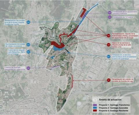 O PAI Horizonte Compostela inclúe tres grandes proxectos co foco posto na sustentabilidade, a accesibilidade e a inclusión, que buscan impulsar unha das zonas menos favorecidas da cidade. Trátase de Santiago Transforma (enfocado á creación de novos equipamentos sociais, culturais e deportivos e vivenda dotacional), Santiago Accesible (orientado á accesibilidade urbana, desde un punto de vista integral) e Santiago Resiliente. (centrado na adaptación ao cambio climático).